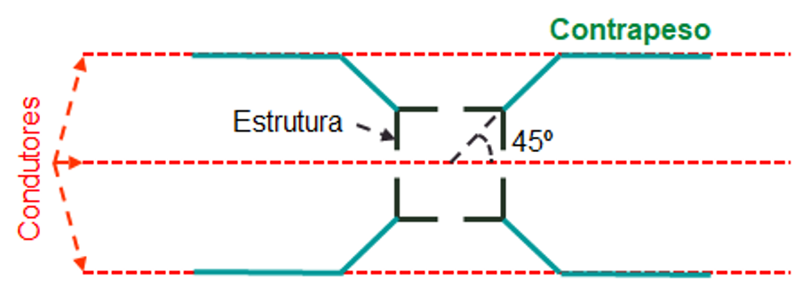 - Quando a estrutura com um ou dois postes, o contrapeso é lançado a partir da(s) base(s) do(s) poste(s), formando um ângulo de 45° com o eixo da LT, em direção ao limite da faixa de passagem ou de serviço, conforme o caso. Daí em diante, o contrapeso segue paralelamente ao eixo da LT.