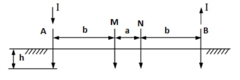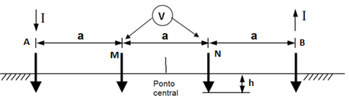 Neste arranjo os quatro eletrodos são igualmente espaçados, como mostrado na Figura abaixo, onde A e B são os eletrodos de corrente e a tensão é medida entre os eletrodos M e N.