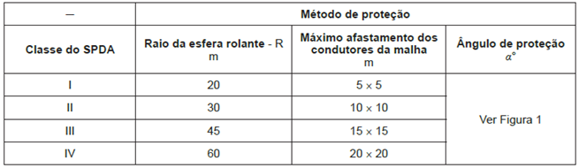 Para se determina a forma de proteção de uma instalação podem ser adotadas três tipos de metodologias que são: Ângulo de proteção, Esfera rolante e método das malhas, que possuem uma relação com a classe do SPDA e a dimensão a ser protegida, conforme tabela abaixo: