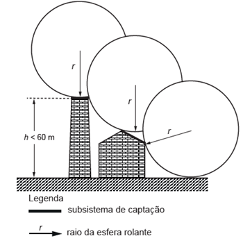 O adequado posicionamento do subsistema de captação na aplicação deste método ocorre se nenhum ponto da estrutura a ser protegida entrar em contato com uma esfera fictícia rolando ao redor e no topo da estrutura em todas as direções possíveis. O raio, r, dessa esfera depende da classe do SPDA (ver Tabela 2). Sendo assim, a esfera somente poderá tocar o próprio subsistema de captação.