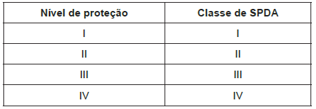 Classe do SPDA - As características de um SPDA são determinadas pelas características da estrutura a ser protegida e pelo nível de proteção considerado para descargas atmosféricas. A Tabela 1 apresenta as quatro classes de SPDA (I a IV) definidas nesta Norma e que correspondem aos níveis de proteção para descargas atmosféricas definidos.
